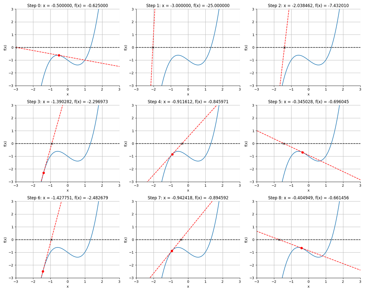 The algorithm struggles to converge because the initial tangent line is nearly horizontal. This results in the next guess being very far off target and ultimately the algorithm oscillates irregularly around the starting point. However, at step 12, it happens to land just to the right of the local minimum at \( x = 0.7425 \), which sends the next guess far to the right of all local extrema.