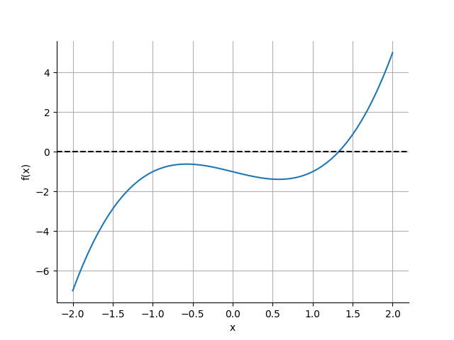 The Newton-Raphson algorithm is a well-known numerical routine for finding the roots (a.k.a. zeros) of a function. I think it's best illustrated by way of example. I found one at https://atozmath.com/example/CONM/Bisection.aspx?q=nr&q1=E1 that involves finding the single zero of the function \( f(x) = x^3 - x - 1 \). The function is plotted below: