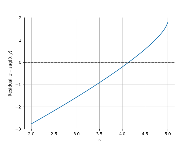 The first thing to note is that the residual \(z - \text{sag} (x, y) \) is oscillating in sign which indicates that the algorithm is hopping back and forth between different sides of the surface. The root estimate s appears to slowly be converging to some value but hasn't yet done so. In fact, it took 100,000 iterations to converge to within 0.0004 of the root, which was somewhere around s=4.14. This rate of convergence is much too slow. What could be causing it?